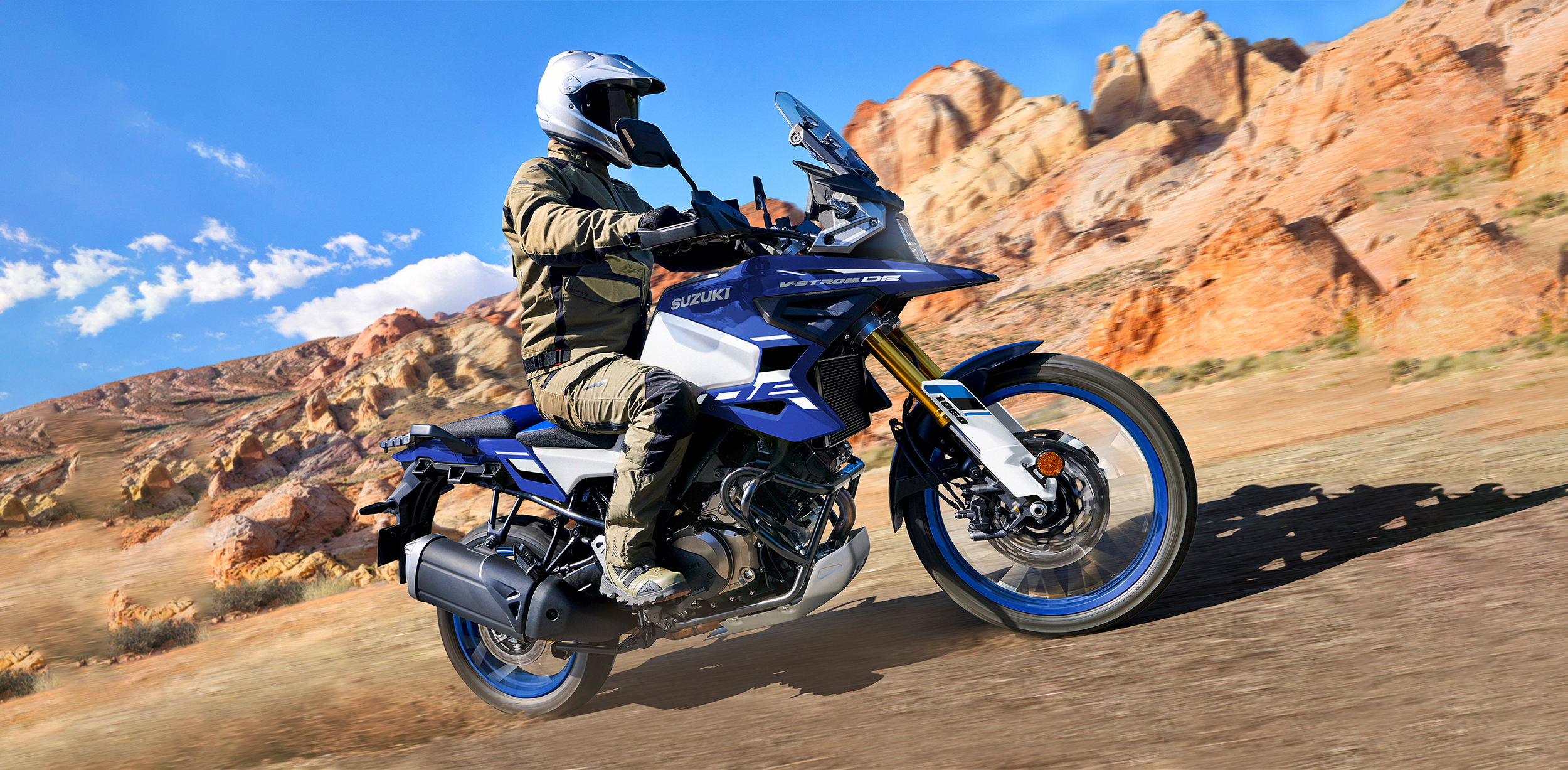 - The V-STROM 1050DE and 1050DE Adventure models receive their own dedicated chassis geometry with a longer wheelbase, longer rake, more ground clearance and a wider handlebar grip. The purpose is to improve stability and controllability when riding on unpaved surfaces and to provide a comfortable riding position that effectively distributes weight to the front and rear.