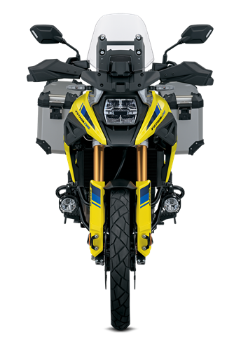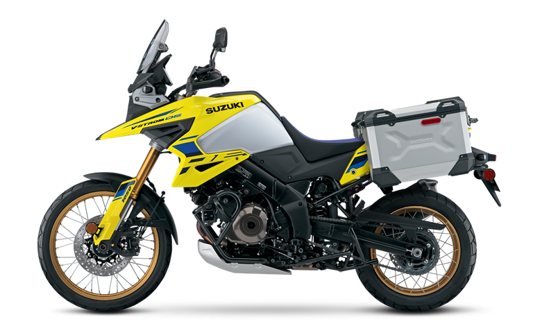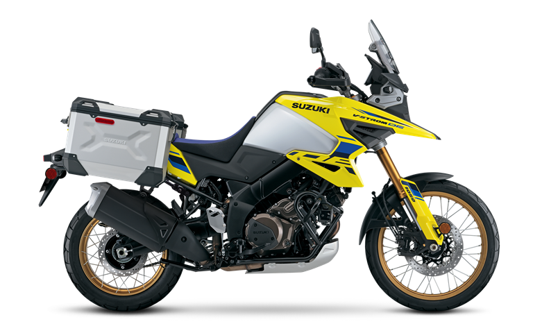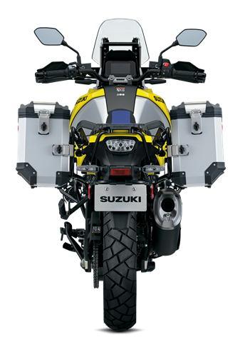 Included are Suzuki’s ADV-style, 37-liter aluminum panniers that attach to powder-coated, stainless-steel carriers.