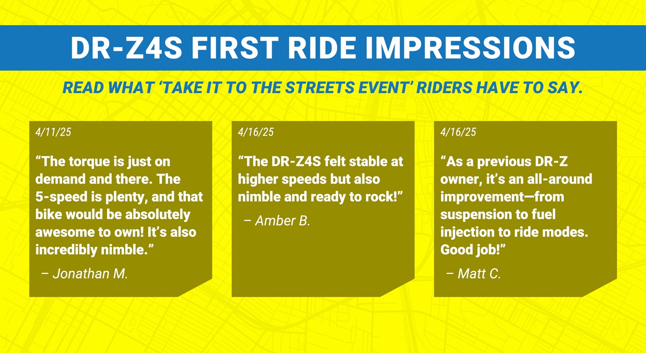 To better suit off-road riding, the new large diameter tapered aluminum handlebar is set 1.10 in. (28 mm) higher while the new, wider rider’s pegs are set 0.27 in. (7 mm) higher and 0.90 in. (23 mm) farther back, and the seat height is slightly decreased from 36.8 in. (935 mm) on the DR-Z400S to 36.2 in. (920 mm) on the DR-Z4S.