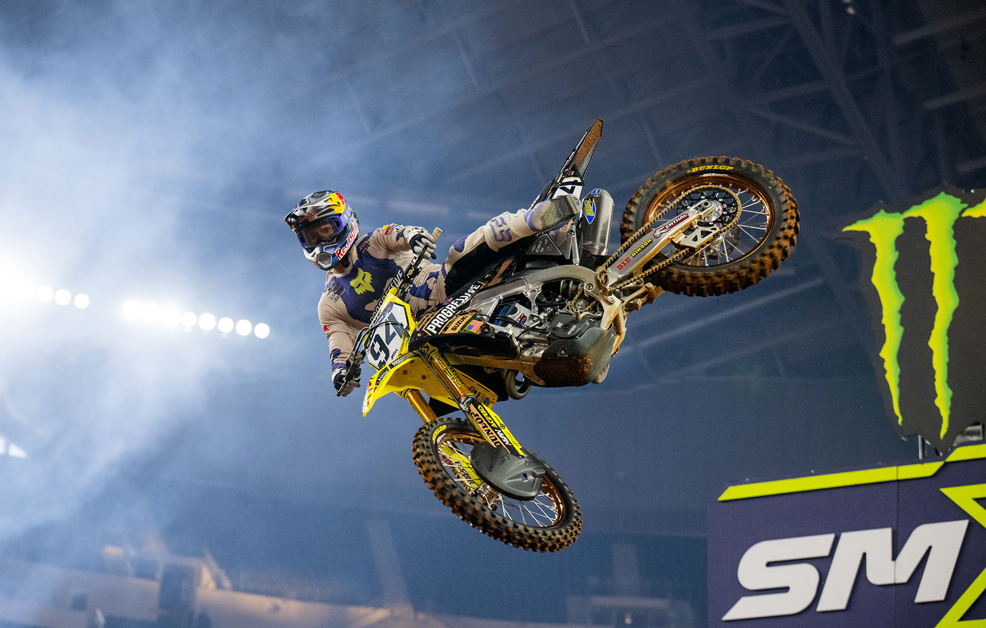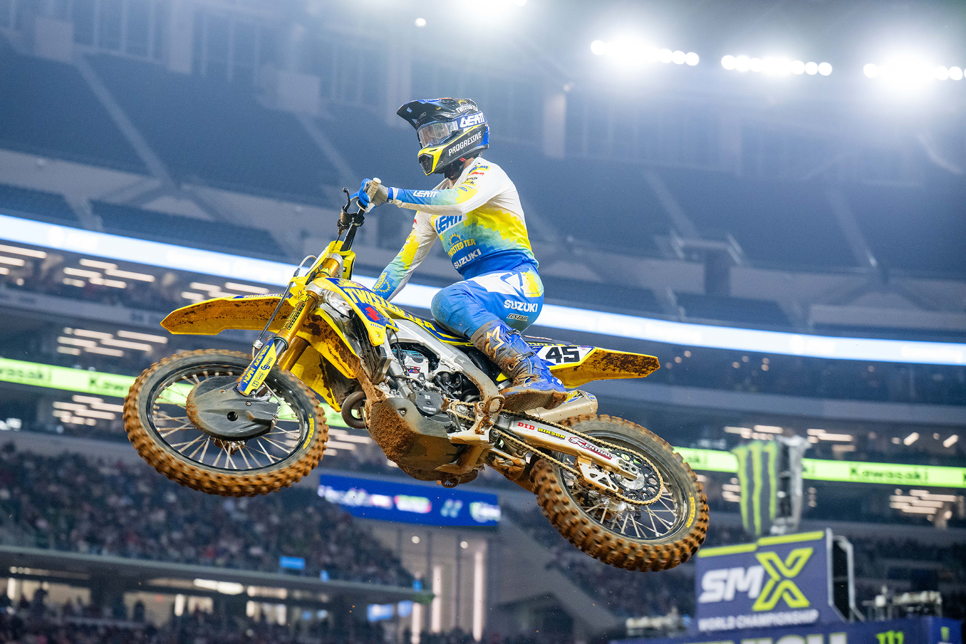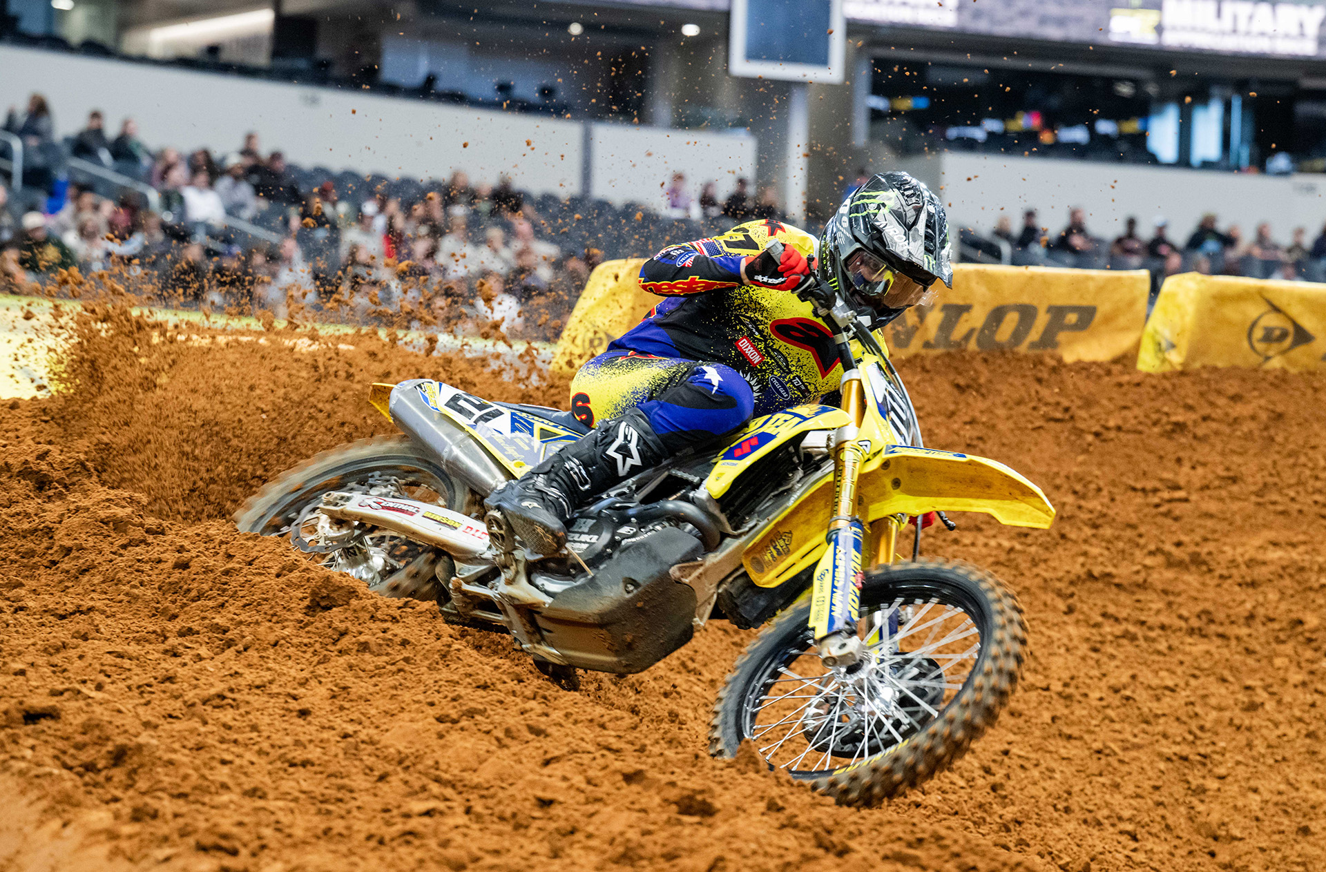 Ken Roczen (94) was feeling under the weather coming into Arlington, but his speed didn’t initially seem affected. Roczen carded the second-fastest time in the second qualifying session which held for the second-fastest overall qualifying spot. He carried that track speed into his heat race where Roczen holeshot and led every lap despite challenges from his teammate Jason Anderson. When the gate dropped for the main event, Roczen and his Suzuki RM-Z450 rocketed around the first turn and emerged in second place at the holeshot stripe. After an intense battle through the first few sections, Roczen took sole control of the lead, set the race’s fastest time through the challenging whoops section (Sector 7), and set his sights on a second win in 2026. Roczen defended against several challenges and retained control of the race from the green flag through the 17th of 26 total laps. When the dust settled in Texas, Roczen had demonstrated again that he is a top contender for the 2026 Supercross title.