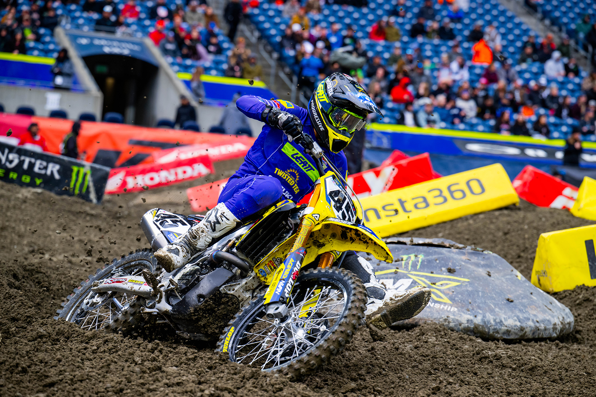 Ken Roczen (94) demonstrated the breadth of his talent in Seattle. After delivering a runaway main event win the weekend before on the hardpack of Glendale, Arizona, Roczen and his Suzuki RM-Z450 earned an uncontested victory in his heat race at the Seattle Supercross. In the Seattle main event, Roczen crossed the holeshot stripe in sixth place then launched a drive to the front; by lap three he had secured third place. As the top three riders pulled clear of the field, Roczen put in surges to get into position to attempt another pass. Late in the race, another rider jumped into Roczen in the sand section and both racers went down. It was the end of Roczen’s hope of a Seattle podium; he crossed the line inside the top ten and remains inside the top 3 in the championship standings.