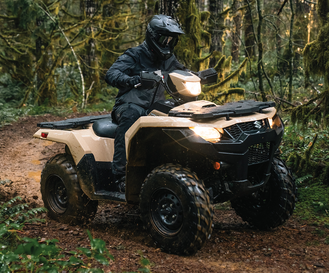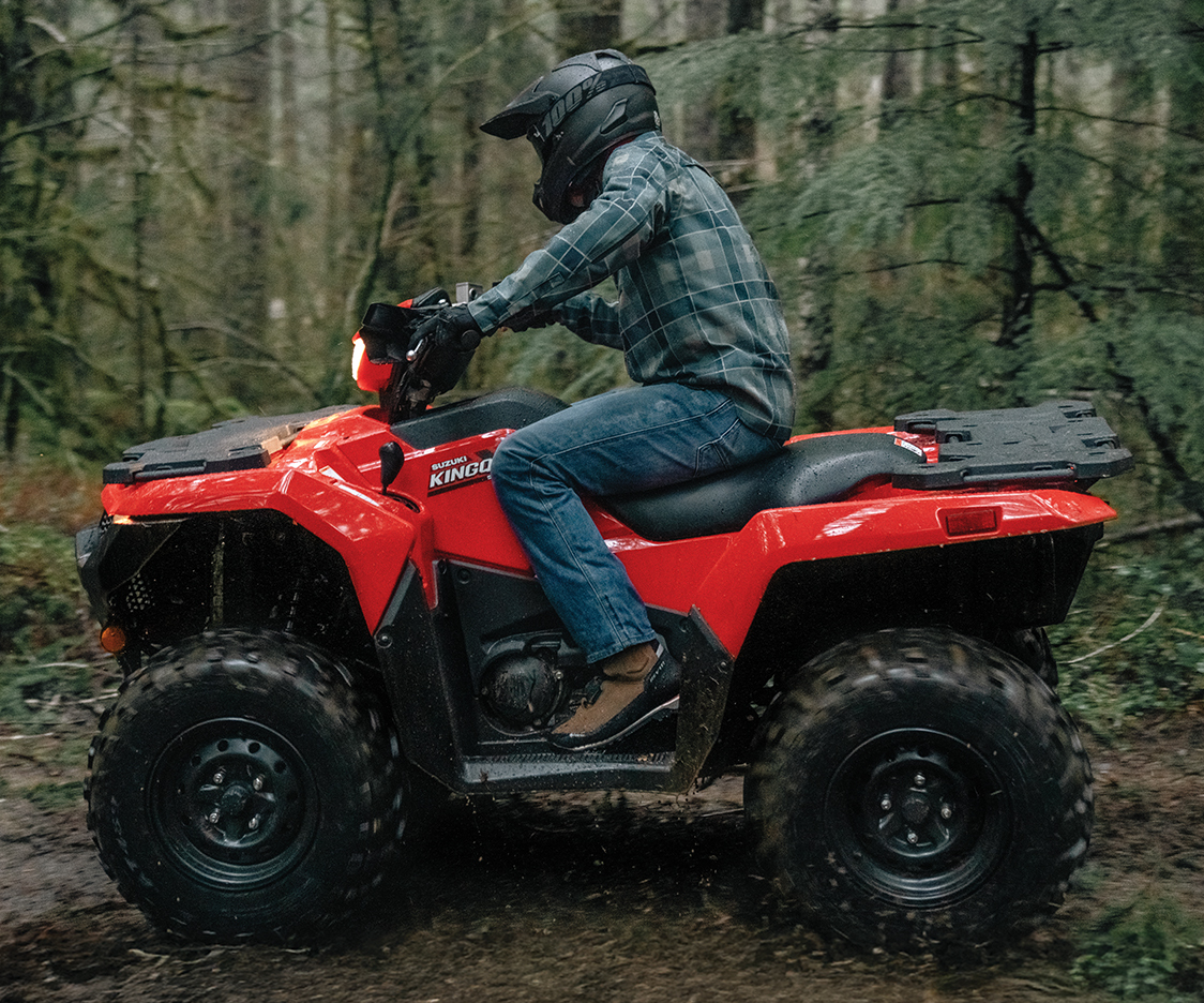 *Suzuki KingQuad ATVs may be used only by those aged 16 and older. At Suzuki, we want every ride to be safe and enjoyable. Always wear a helmet, eye protection, and protective clothing. Never ride under the influence of alcohol or other drugs. Study your owner’s manual and always inspect your Suzuki before riding. Take a riding skills course. For the nearest ATV skills course, call the SVIA at 1-800-852-5344, and we will even pay for the training. Along with concerned conservationists everywhere, Suzuki urges you to Tread Lightly!® on public and private land.