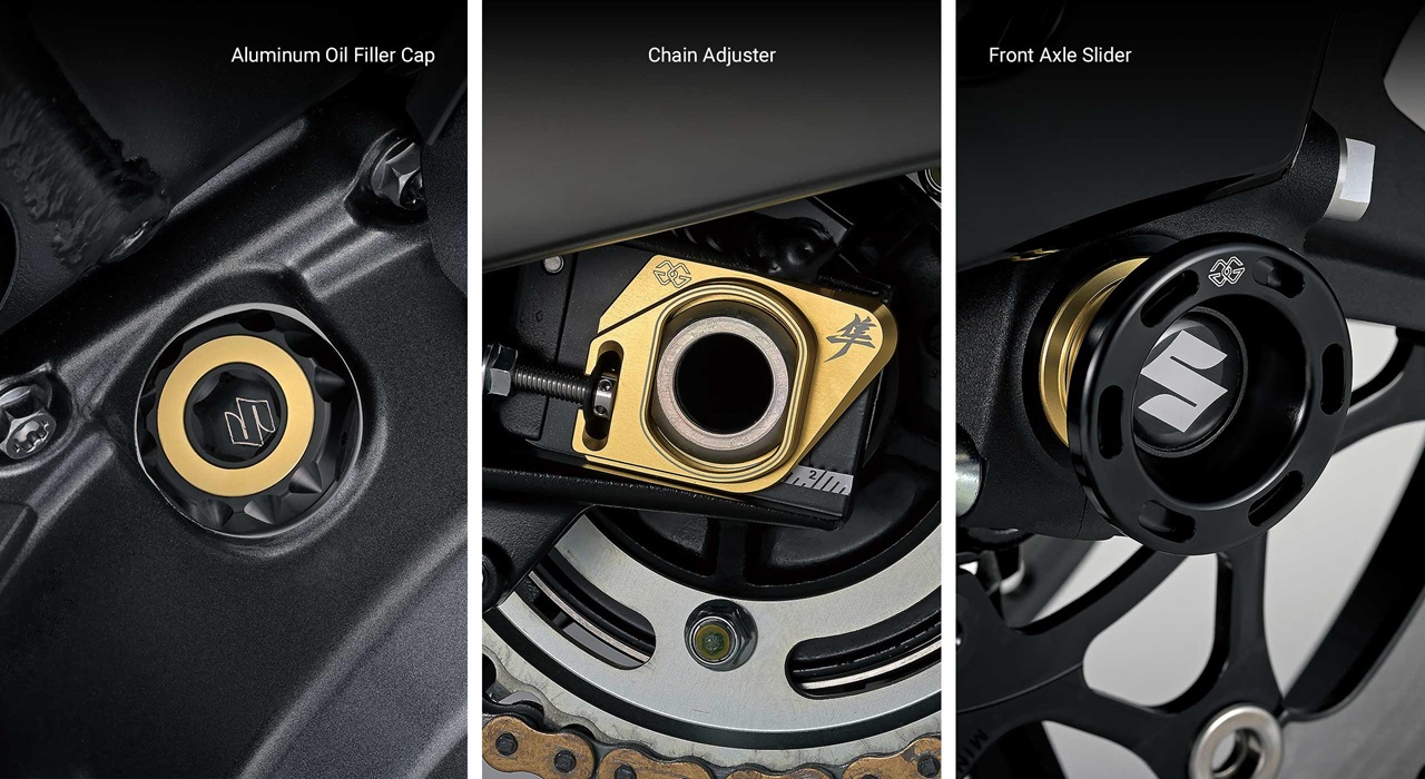 1340cc in-line 4-cylinder fuel-injected, liquid-cooled DOHC engine is fed by Suzuki’s Ride-by-Wire 43mm Electronic Throttle body system. To improve power and torque output in the low- to mid-range, there are four additional Suzuki Side Feed Injectors (S-SFI).