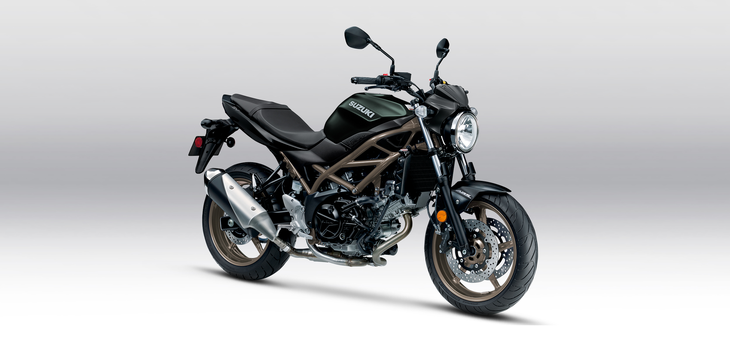 The 2025 SV650 ABS’s trim and aesthetically pleasing Pearl Matte Shadow Green / Metallic Matte Black No.2 bodywork is mounted to a visually stunning, dark gold trellis-style frame.