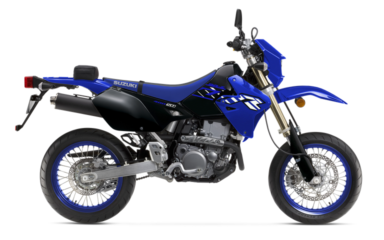 Derived from the off-road DR-Z400, the blue and black or white bodywork features fresh, angular graphics for a race-ready appearance.