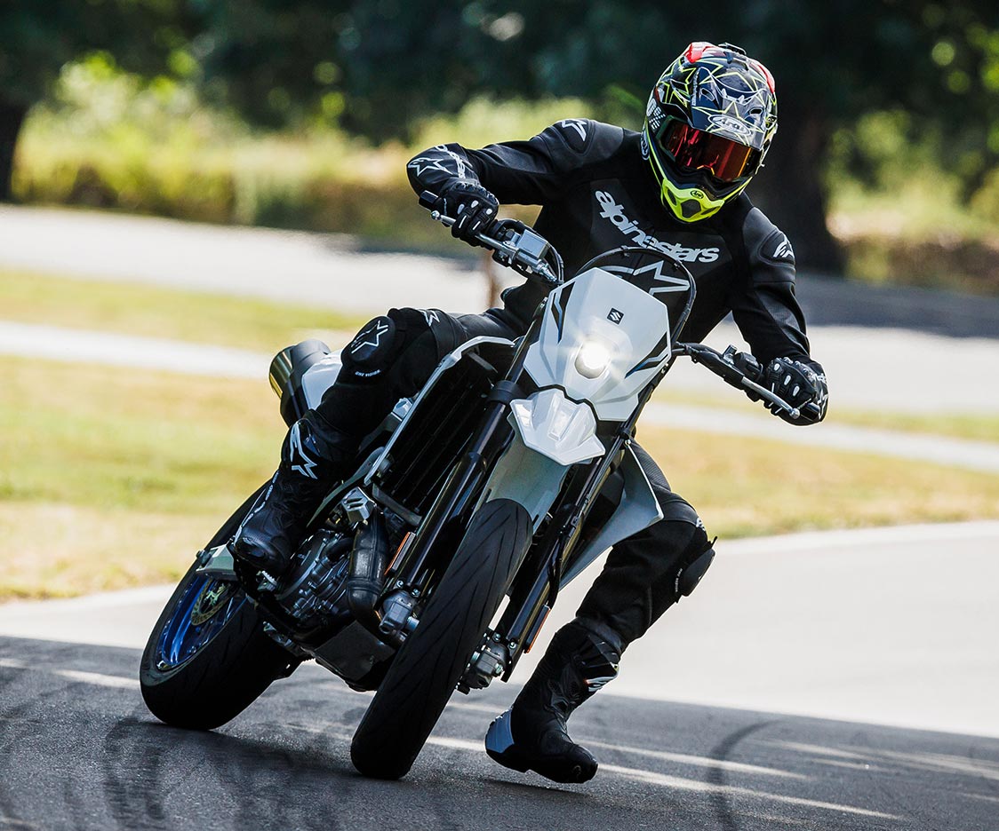 Minimalistic and sleek, styling visually confirms that the DR-Z4SM is an extremely capable on-track motorcycle. Riders can choose the Solid Special White No. 2 bodywork or Sky Gray plastics that blend well with the many blacked-out chassis components.